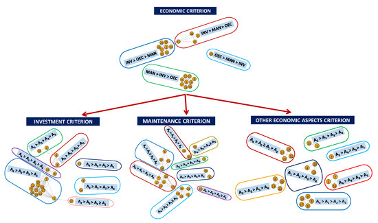 If we analyse each economic sub-criterion (Table 3 and Figure 4), we see that, in general, the most supported alternative is A4 (17 decision-makers in the investment criterion, 18 decision-makers in the maintenance and 12 decision-makers in other economic aspects. For the rest of the alternatives, the support shown for alternative A2 in the investment sub-criterion stands out and tends to occupy the first or second place in the opinion of 17 decision-makers.