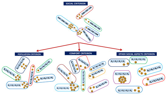 With respect to each social sub-criterion (Table 4 and Figure 5), we can see that the alternative most supported by the 3 sub-criteria is A1 (14 decision-makers in population, 12 decision-makers in comfort and 9 decision-makers in other social aspects). For the rest of the alternatives, the support shown for alternative A2 to occupy the first or second place (19 decision-makers in population, 17 in comfort and 13 in other social aspects) stands out.
