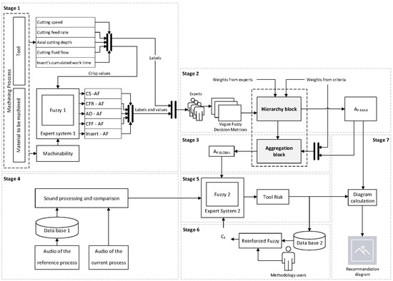 Generally speaking, the methodology consists of 7 differentiated stages that can be seen in Figure 1. First, Stage 1, Expert System 1, which uses a Mamdani-type fuzzy inference engine, is in charge of processing the general parameters (cutting speed, cutting feed rate, axial cutting depth, use of coolant, and cumulated use hours of the tool), determining as its output a series of factors associated to each one of the process parameters, named as “aggressiveness factors”: CS-AF (cutting speed aggressiveness factor), CFR-AF (cutting feed rate aggressiveness factor), AD-AF (axial depth aggressiveness factor), CFF-AF (cutting fluid flow aggressiveness factor) and Insert-AF (insert aggressiveness factor), which aim to determine how damaging each one of those process parameters is to the tool’s lifespan. After that, in Stage 2, by contemplating a series of experts and criteria, the hierarchization of those aggressiveness factors is carried out using vague fuzzy numbers, determining a ranking of said factors, and in Stage 3, the Global Aggressiveness Factor of the tool derived from the aggregation process is calculated. In parallel, in Stage 4, the machining process audio data are captured and processed, determining a series of characteristic metrics that, together with the tool’s Global Aggressiveness Factor, are fed into Expert System 2. In Stage 5, Expert System 2, which also uses a Mamdani-type fuzzy inference system, produces the Tool Risk level as its output. It is relevant to highlight a distinctive feature of this second expert system: it incorporates a reinforcement block, implemented in Stage 6 and named “Reinforcement Fuzzy”, which represents a reinforcement strategy based on Expert System 2′s knowledge base. This block will determine a correction factor that will allow for correcting potential undesired operations in the system by adjusting the logical structure and the importance of the production rules of Expert System 2. Finally, in the 7th and last stage, by contemplating the tool risk level and the different aggressiveness factors, it will be possible to construct a sector diagram that will be used to graphically visualize the factors’ values (sector areas) and the tool risk level (thickness).