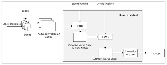 In the last decade, and as a consequence of the development of inference systems, hierarchization methods have been developed, aiming to reduce the inconsistency, uncertainty and inaccuracy issues commonly associated with the methods considered “classic”. The use of fuzzy algebra [60,61] has involved the incorporation of an efficient uncertainty control into hierarchization processes. In this sense, the algebra of vague sets is of special interest [62], which might be interpreted as intuitionistic fuzzy sets [63]. This is an approach that arises from the re-interpretation of the classical fuzzy set, extending the use of the membership function concept, and which is being used for multi-attribute problems with multiple decision-makers [64]. In essence, a vague fuzzy set [62] determines the interval within which the degree of membership of a value to a given fuzzy set lies, defining the limits of the membership and non-membership levels to that fuzzy set. Vague numbers were developed later than intuitionistic numbers, although they are in essence the same, using a similar reasoning and interpretation [65,66]. Both in the classic fuzzy sets and in the generalization that the fuzzy vague sets represent, the “membership” concept is associated with a degree of membership, in which a specific value complies with—or affirms—a certain premise when evaluated within a closed interval [0, 1], with 0 being the null degree and 1 the maximum degree of membership, respectively. Based on that definition, intuitionistic numbers—being vague numbers for all intents and purposes [63]—introduce the “non-membership” function concept, similar to the abovementioned classic fuzzy set, that is, a measurement of the degree, between 0 and 1, to which a specific value does not meet, or negates, a given premise. This conceptualization was adopted by Gau and Buehrer [62] in their vague numbers definition, establishing similar “truth-membership” and “false-membership” functions.