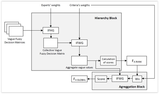 Detail of the hierarchization and aggregation blocks. IFHG refers to the Intuitionistic Fuzzy Hybrid Geometric operator, IFWG to the Intuitionistic Fuzzy Weighted Geometric operator, and Wv corresponds to the weights vector of the aggregation block input variables.