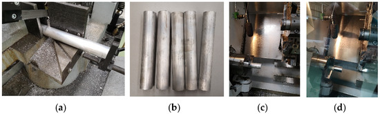 Figure 4a shows the cutting of the stock bars for the tests. Figure 4b shows the cut metal stocks. Figure 4c shows the machining cabin with the metal stock placed in the lathe chuck prior to being machined. Finally, Figure 4d shows the machined part, after undergoing several round-turning passes.
