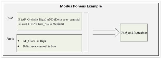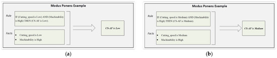 Despite the fact that Mamdani inference systems [69,70,71,72] are well known, it is required to point out that the inference system that they use is not related to their implication, but to the tautology used to combine and to simulate the knowledge derived from the set of declarative rules representing the knowledge base. Generally speaking, a tautology based in the modus ponens deduction is used, in which the consequent of a premise to be evaluated is a function of the degree of certainty of the antecedent of the rule representing the knowledge used to evaluate such premise. Therefore, in this first expert system, the inference mechanism tautology is related to the different common-language qualifiers used to analyze each one of the input variables, and to relate them to the output variable. Thus, for example, if the variable associated to the cutting speed belongs to a “high” qualification and the material machinability is “low”, then the knowledge is modeled according to the experts’ expertise, resulting in the production of an aggressiveness factor associated to a “high” cutting speed. This implies that, when a premise related to the speed and the machinability is introduced, from this premise a conclusion must be derived. If the premise presents the same membership degree as the one represented in the declarative rule, then its consequent will be the same as the one represented in said rule, using modus ponens reasoning.