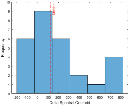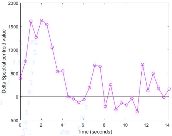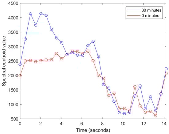 - Step 3—Once the centroid graphs for the spectra of both signal samples have been established, it is possible to calculate the difference between them, and later to determine the area associated with a given time interval;