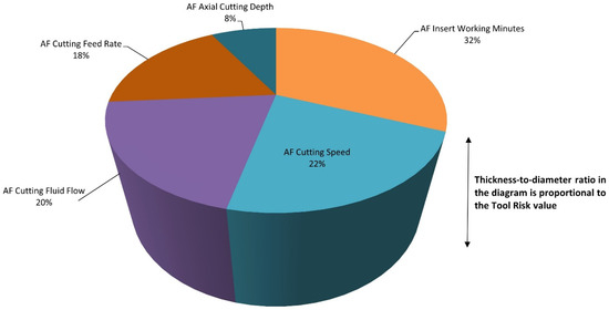 Using the Tool Risk value and the hierarchy of the different aggressiveness factors associated with each of the variables of the previously determined process, it is possible to plot a 3D sector diagram in which the relative area of each of the sectors represents the proportion of the risk associated with each of the process variables, while its thickness represents the Tool Risk as a function of the diagram’s diameter. Through the interpretation of this diagram, it is possible to determine the process variables that must be changed to increase the machining tool’s lifespan.
