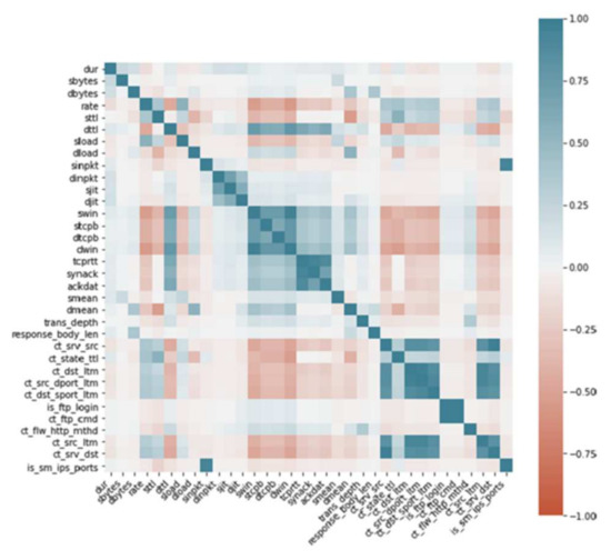 We computed the correlation matrix of all the variables and eliminated those variables that do not correlate with the target variable. The correlation matrix for all the input variables is shown in Figure 2. As shown in Figure 2, there are some input variables where either they have no correlation with the target variable or they have a strong correlation with each other. We have removed those variables as well. After analyzing the correlation matrix, we are removing attack_cat, proto, service, state, id, spkts, dpkts, sloss, dloss, and ct_dst_src_ltm. The potential features that we are using in the proposed NIDS are shown in Table 4.