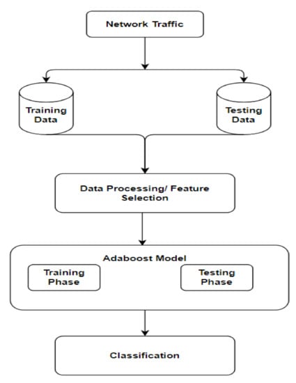 From the above literature review, we observed that that previous research uses Adaboost mainly for the weight update property and does not consider the importance of discriminative features to distinguish the threats from normal network activity. Thus, we believe in using a complex dataset (UNSW NB 15), (UNSW Canberra: Canberra, Australia) selecting the most discriminative features, and utilizing AdaBoost as a weight update model. At the same time, the decision tree is a primary classifier. Decision trees perform exceptionally well on network data. The weight update in the algorithm is done by Adaboost, which shows promising results when used in combination with the decision tree.