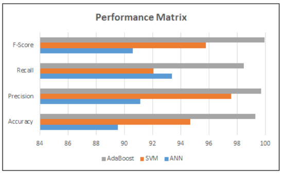 Figure 4 presents the performance evaluation matrix between the accuracy, precision, recall, and F-score among the SVM, ANN, and Adaboost-based decision tree classifier models.