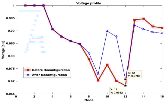 Any solution network topology in Set 1 has a lower real power loss but a greater load balancing index than any solution network topology in Set 2. As a result, the solution network topologies in the two sets are Pareto-optimal in relation to one another. Given that the solution to the multi-objective problem requires just one network topology, the voltage profile is utilized to select the best optimal network topology from the two sets. Figure 7 and Figure 8 depict the voltage profiles of the network topologies in Sets 1 and 2. Figure 7 and Figure 8 show that the solution network topologies in Set 1 have a better voltage profile than those in Set 2. Furthermore, in Figure 7, the solution network architecture 4 from Set 1 has the best voltage profiles. As a result, the optimal solution of the multi-objective feeder reconfiguration problem for the 69-bus distribution system is solution network topology 4 from Set 1.