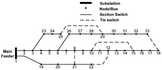 Because the switching states of the feeder can only have values of 0 (open switch or tie-line) and 1 (closed switch or tie-line), the distribution network feeder reconfiguration problem is of a discrete character (closed switch or section line). Many scholars, however, avoid the difficulties associated with binary problems by treating distribution network feeder reconfiguration as a continuous problem and solving it with continuous optimization methods, such as GA, ACO, and HBMO. Ref. [10] used Binary PSO to address the feeder reconfiguration problem. However, because many authors concluded that the canonical BPSO is unsuitable for solving the distribution network feeder reconfiguration problem, the authors were forced to develop a shift operator to construct the binary coding of the PSO and to enable the permutation of 0’s bit into 1’s, and vice versa. In terms of goal functions, the majority of the offered algorithm solutions exclusively address single-objective distribution network reconfiguration. Many scholars who work on multi-objective feeder reconfiguration utilize a weighted-sum approach to simplify the problem and then produce an optimal solution based on the original weight components. Ref. [11] introduced a discretized network reconfiguration using dataset technique by achieving the best solution of network reconfiguration, as well as DG size and placement, using an optimization algorithm known as the Water cycle algorithm (WCA). The approach was proven on IEEE 33 and 69 bus systems and was used to optimize DG power factor for power loss mitigation. Ref. [12], presented the Harris hawks optimization (HHO) method for distribution network reconfiguration with the goal of reducing total power loss, while maintaining an improved distribution network voltage profile. The suggested method’s efficacy was proved on two conventional IEEE 33 and 85 bus systems, as well as an artificial 295 bus system, under DG and load fluctuation.
