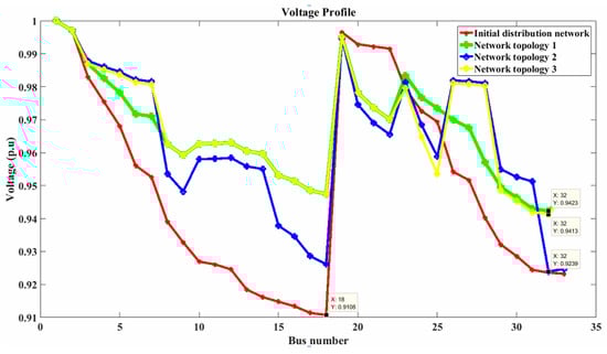 Voltage profiles of optimum network topologies for the 69-bus distribution system in Set 1.