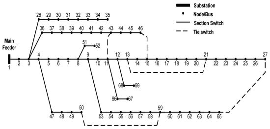 The remainder of the paper is structured as follows. Section 2 describes the formulation of the distribution network feeder reconfiguration problem. Section 3 describes the developed Discrete Particle Swarm Optimization (DPSO) method in depth. Section 4 goes into depth about the findings of the suggested technique with the various case scenarios that were investigated. Section 5 compares the developed DPSO findings with literature in detail. Finally, in Section 6, the broader conclusions are provided based on the detailed results reported in Section 4.