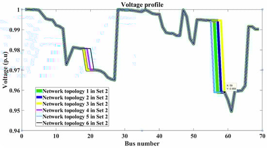 Voltage profiles of optimum network topologies for the 69-bus distribution system in Set 2.