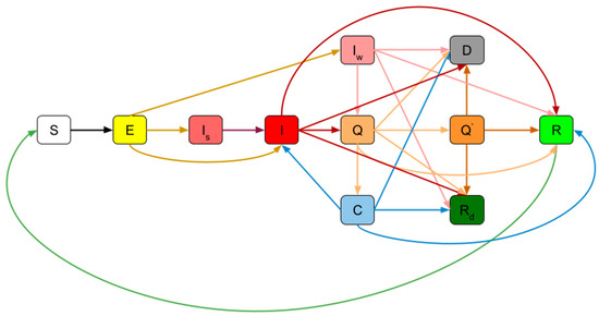 A schematic view of the proposed SIR model: susceptible (S), non-contagious (E), infected people who ignore the symptoms (I_s), infected (I), asymptomatic infected (Iw), in quarantine (Q), in the intensive care unit (Q’), carriers (C), recovered (R), recovered immobilized (Rd), deaths (D).