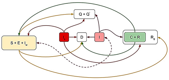 - Recovered immobilized (R_d): includes individuals who have recovered and can no longer infect anyone, but for some reason, they no longer interact with other people. Accordingly, they have no chance of getting sick again.