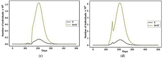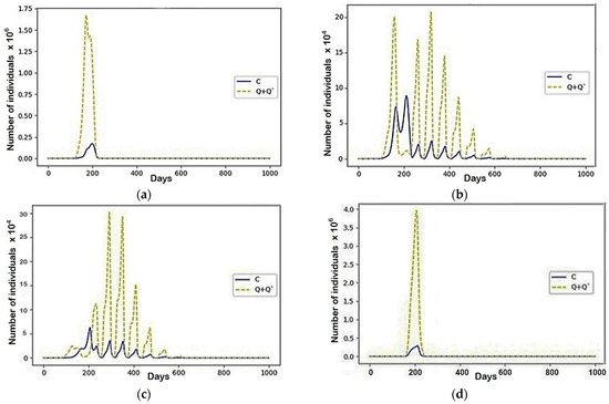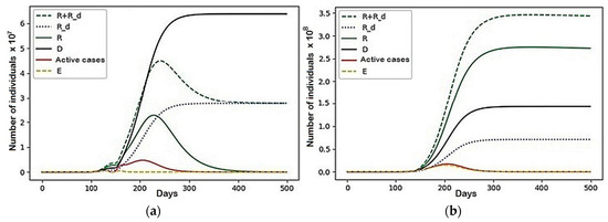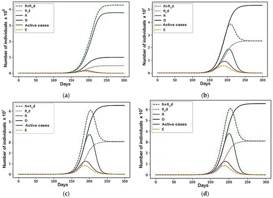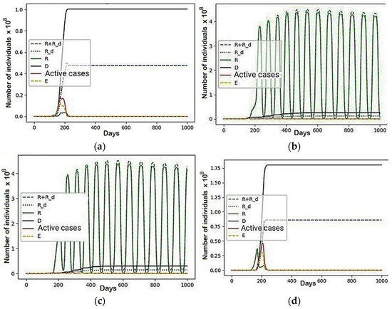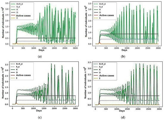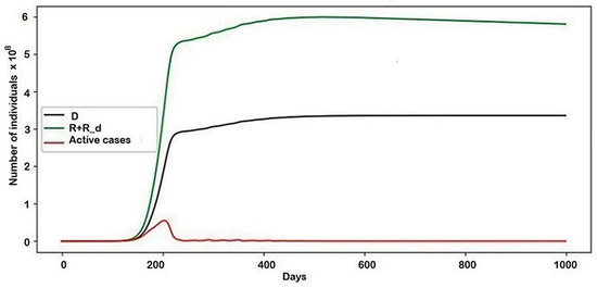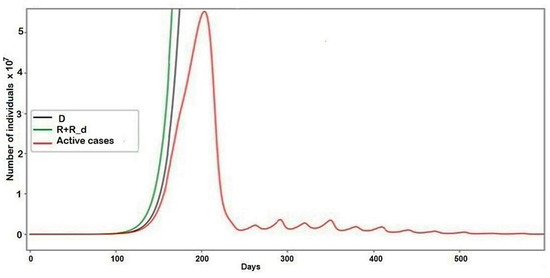 However, as shown in Figure 5, the epidemic did not end there, continuing to rise or fall in the form of damped fluctuations. This, in turn, affected the number of recovered (R + R_d) and dead (D), whose schedules increased for a long time after the peak of the epidemic. As a result of this conflict, the final number of deaths increased by 51,603,004, which is 18% of the death rate in the conventional model.