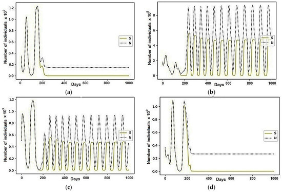 The modeling results describing the total population size (N) and the population belonged to the susceptible (S) group using the parameters represented in Table 1: (a) Region 1; (b) Region 2; (c) Region 3; (d) Region 4.