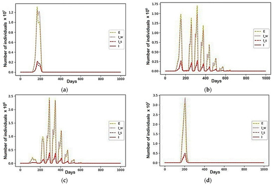 The graphical results a scenario in which , and the rest are equal to zero: (a) Region 1; (b) Region 2; (c) Region 3; (d) Region 4.