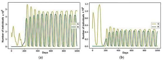 The modeling results describing the recovered (R) and the susceptible (S) group, where , the rest are equal to zero: (a) Region 1; (b) Region 2.