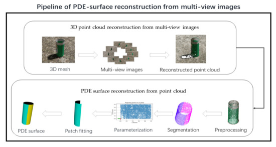 In this paper, we follow the scheme of the first type of method to reconstruct a 3D PDE-based surface from multi-view images, as it is more suitable for our proposed model. Figure 1 shows the general pipeline of our proposed method for PDE surface reconstruction PDE from multiple images. It proceeds as follows: firstly, 3D point clouds data will be reconstructed from multiple-view images; then, the PDE-based surface is obtained by fitting it to the reconstructed point clouds data. To be more concrete, in the first step, many algorithms reported in the literature can be applied to reconstruct 3D point clouds from multiple 2D images of certain objects or scenes, and they have various characteristics, so choosing a suitable algorithm for a certain object is necessary. Since multiple images of certain objects or scenes are required to reconstruct 3D point clouds data, we also have to consider how to obtain such multiple images. In this paper, we consider synthetic multi-view 2D images data of a chosen 3D object as rendered from multiple views by using the popular open-source 3D computer graphics software, Blender. When it comes to the next step, reconstructing the PDE surface from point clouds data also consists of several sub-steps, including filtering obtained point clouds data from the last step, segmenting the point clouds into multiple subsets when necessary, parameterizing the point clouds in each subset, and fitting the PDE patch to each parameterized point clouds subset; finally, the PDE surface is reconstructed. Details about all these procedures are given in Section 3.