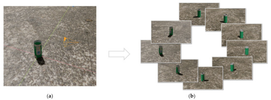 The first step consists of obtaining a collection of suitable multi-view images from a given 3D object or scene. This task is more challenging than it seems at first sight, as it requires the images to cover the entire surface of the object for a proper reconstruction. The multi-view images can be obtained either manually or automatically; the former method means we take multi-view images of a certain object with a professional camera or just our smartphone, which is not easy and is inconvenient; we can also obtain multi-view images of a certain object automatically by taking advantage of the rendering function of the software. For example, Bianco et al. “created a plug-in module for the Blender software to support the creation of synthetic datasets” [36], aiming to evaluate the performance of the structure from motion pipelines. In this paper, the multi-view images are obtained automatically using Blender software. However, there are also many factors that should be taken into consideration before starting rendering multi-view images of an object. First of all, the object to be reconstructed should own a varied texture; the number of rendering images must cover the entire surface of the object, and the rendering images should be of high quality to ensure better 3D point clouds data. We should set up the scene and render details carefully to meet these requirements. Figure 2 shows the set-up scene and the rendered multi-view 2D images by rotating the camera around the object every five degrees, so 36 rendered images cover the whole object; only 9 of the 36 images are shown in Figure 2b for clarity. These rendered images are used as the input of specialized algorithms for point clouds reconstruction from multi-view images, as explained in the next section.