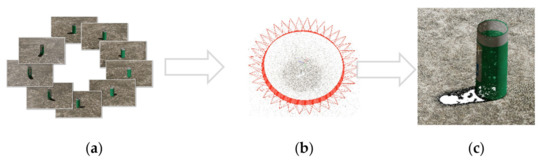 Figure 3b shows the reconstructed result obtained from the Meshroom algorithm. As shown in Figure 3b, the point cloud reconstructed with the Meshroom algorithm is incomplete. When using the VisualSFM algorithm, the reconstructed point cloud is similar to the one obtained from the Meshroom algorithm. Therefore, both Meshroom and VisualSFM algorithms are not suitable. In contrast, the point cloud reconstructed with the Colmap algorithm is complete as shown in Figure 3c.