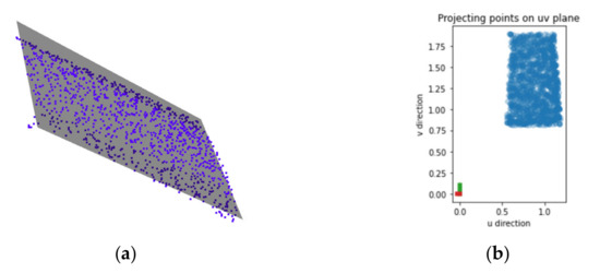 (a) Fitting plane to the point clouds; (b) projecting points to the projecting plane (u, v plane).