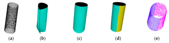 For the cylinder point clouds, an automatic segmentation method is used. We first find a symmetric plane oriented in the vertical direction for the cylinder point cloud. Then, we use the plane to divide the point cloud into two groups. Each of the groups is a subset of the cylinder point cloud. The obtained subsets are shown in Section 5.