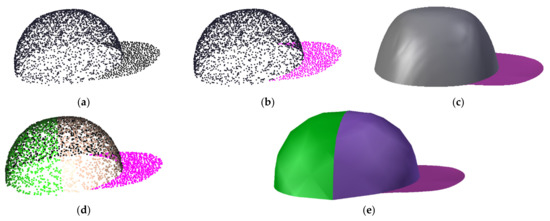 In order to show how different numbers of segments affect the reconstruction quality, we segment the top of the hat in to two different segments: one subset only as shown in Figure 11b, and two subsets as shown in Figure 11d. The reconstructed models are shown in Figure 11c,e, respectively. Comparing the shapes in Figure 11b,c, we can find that when the top of the hat has one segment, the top part of the reconstructed hat model is flat, which is different from the round shape of the corresponding point set. In contrast, when the top of the hat is segmented into two subsets, the top part of the reconstructed hat model becomes round, which is the same as the shape of the corresponding point sets.