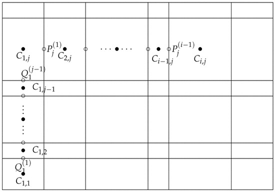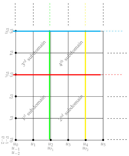 Let us consider a domain, as in Figure 3, and the first subdomain, where minimal configuration is present. From (8), we have , , . For , applying it repeatedly, we can write (see Figure 4)