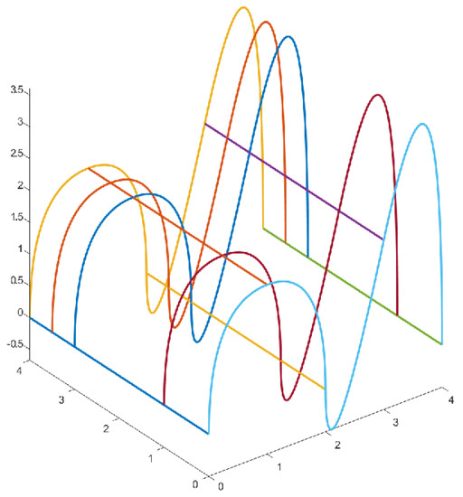 In this first example, we show a curve network to be interpolated (Figure 5) and compare tensor product and triangulated surfaces (Figure 6). Here, we consider two subdomains of the parametric domain , being the barrier at knot . As remarked in Section 1, the higher degree of tensor product appears in the higher oscillations.