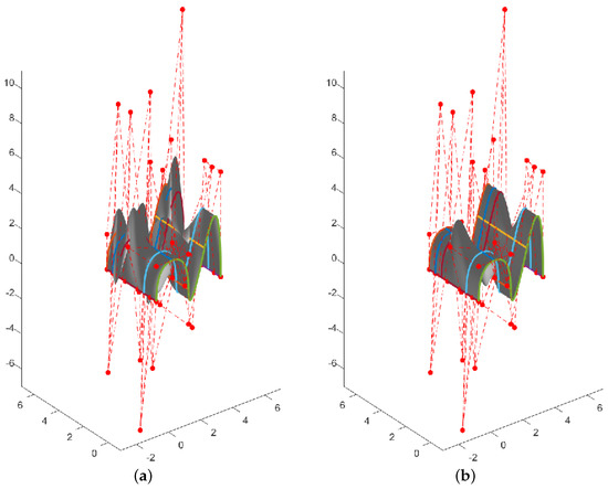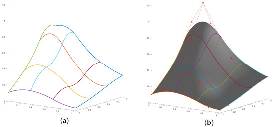 (a) Tensor product and (b) triangulated surfaces with , , , being the barrier at knot . The network control points are taken from Test 3 of [26].