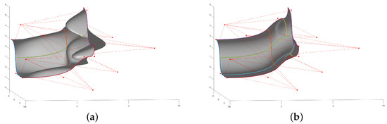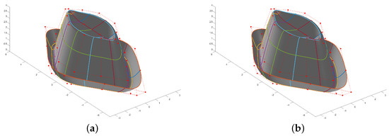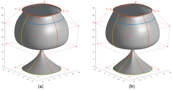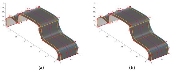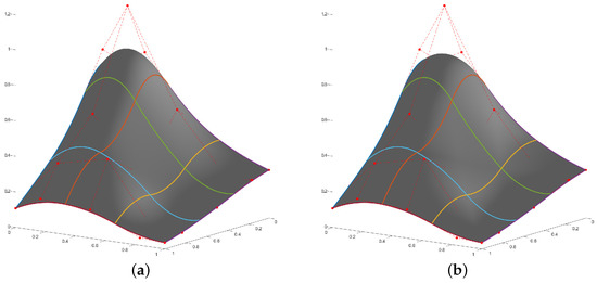(a) Tensor product and (b) triangulated surfaces with , and the two free control points and , interpolating the curve network in Figure 5.