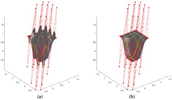 (a) Tensor product and (b) triangulated surfaces with , and free control point , obtained by the minimization process (24).