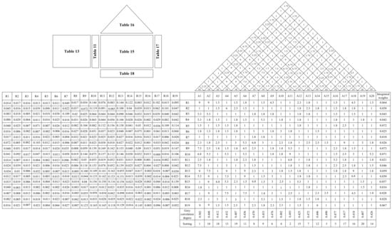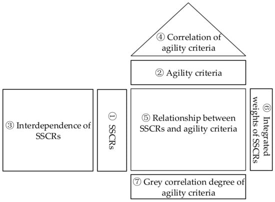 The direct relation matrix of agility criteria obtained in step 4 was multiplied by the mutual relation matrix of SSCRs and agility criteria in step 4 to obtain the original matrix of GRA. Using GRA, the integrated weight (⑥) of SSCRs and the grey correlation (⑦) of agility criteria were obtained; they are located to the right and below the HoQ in Figure 1, respectively. Finally, the agility criteria were ranked according to the grey correlation degree.