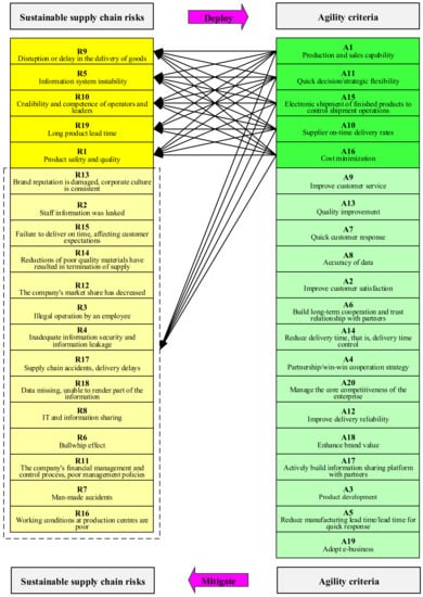 As the global economy develops and the complexity of supply chains increases, the effective mitigation of sustainable supply chain risks in electronics manufacturing has become important. While quality function deployment (QFD) has been successfully applied to many fields of multicriteria decision-making (MCDM), there is a lack of research on constructing a house-of-quality model that can be combined with MCDM for connecting supply chain agility with sustainable supply chain risks, especially in the field of electronics manufacturing. The objective of this study was to develop an integrated framework of QFD and MCDM and to devise an effective method to mitigate sustainable supply chain risks by improving supply chain agility. Such a method can help the multinational electronics manufacturing industry to develop stable and sustainable supply chains. In a multinational electronic manufacturing enterprise as an example, the results showed that the case enterprise work should focus on improving agility ‘production and sales capability’, ‘quick decision-making/strategic flexibility’, ‘electronic shiapment of finished products to control shipment operations’, ‘supplier on-time delivery rates’ and ‘cost minimization’. Improving agility would help enhance the ‘credibility and competence of operators and leaders’ and ‘product safety and quality’ and reduce ‘goods disruption or delay due to inadequate supply mobility and poor financial performance’, ‘information system instability’, the ‘long product lead time’ and other key sustainable supply chain risks. The proposed framework can not only be effectively used by other electronics manufacturers to develop agile strategies to mitigate sustainable supply chain risks, but also provides a reference for risk management for manufacturers in other fields.