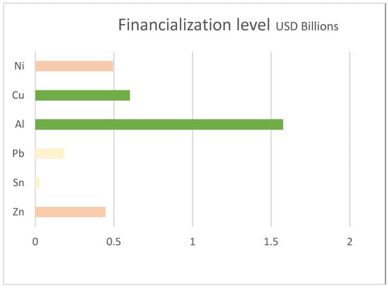 Financialization level per metal, financial institutions holdings on LME. Note: Ni (nickel), Cu (copper), Al (aluminum), Pb (lead), Sn (tin), Zn (zinc).