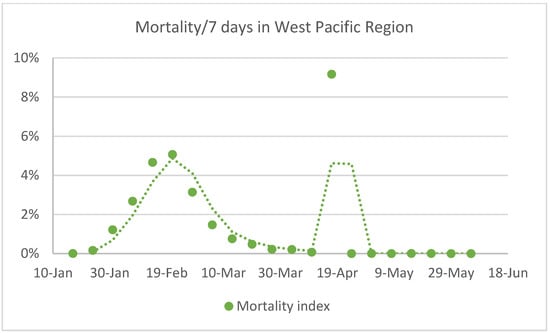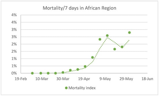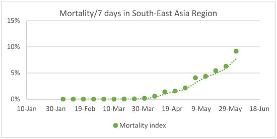 Eastern Mediterranean, South-Eats Asia and Europe regions have shown constant increases, but Europe has shown a very significant constant increase in the seven days mortality index.