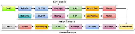 We chose these two transformers for MisRoBÆRTa because they had the best overall results among the pretrained transformers (Section 5) when classification was done using the simple neural network model (Section 3). Each embedding was then the input to a new block (branch) formed using the following layers: BiLSTM, reshape, CNN, max pooling, and flatten. During the ablation testing presented in Section 5.5 we obtained better results when employing two BiLSTM layers for the BART branch. The output of the flatten layers was then concatenated, reshaped, and sent to another block (ensemble branch) containing the same layers that had, as input, the RoBERTa embeddings (RoBERTa branch). Finally, there was a dense layer for the output of the classification.