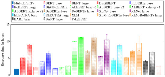 We respond to the research questions as follows. The overall best accuracy among the transformer models is obtained by BART (91.94%), while DistilRoBERTa obtains the best accuracy (91.32%) in the least amount of time required for fine-tuning and training, i.e., 1.93 h on average. MisRoBÆRTa outperforms both of these models’ w.r.t. accuracies (92.50%) and performance times (1.83 h). We empirically observed that between BART base and large, the difference in performance is insignificant, while the difference in runtime is of almost 2.62 h on average. Moreover, some improved models of BERT slightly outperform the base model, i.e., DeBERTa and RoBERTa, while most fall short. Furthermore, multilingual models, such as XLM, do not obtain better accuracy than BERT base.