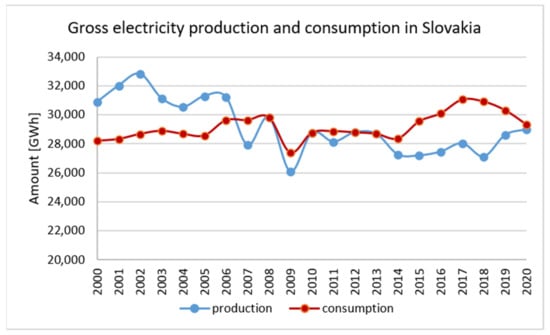 After a significant decrease in electricity production in 2018, its production grew substantially in 2019. The amount of electricity produced from Slovak sources increased by 1460 GWh compared to 2018 and achieved 28,610 GWh in 2019. In 2016, electricity consumption crossed 30,000 GWh for the first time in history. In the following years, the consumption grew continuously until the culmination in 2018. However, in 2019 electricity consumption achieved 30,309 GWh, which means a considerable decrease compared to the previous year (−637 GWh, year-to-year index of 97.9%) and in 2020 the value was again below the level of 30,000 GWh [1]. The amounts of electricity production and consumption in Slovakia during the years 2000–2020 are listed in Figure 2.