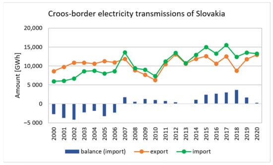 The cross-border flows balance of ES SR has been in favor of import direction since 2007. In 2020, a substantial decrease in cross-border transmissions was measured compared to 2019. In the import direction, they were lower in total by 250 GWh, but in the export direction they dropped by 1132 GWh, and the import balance from 2014 achieved the lowest value (318 GWh) [1]. The amounts of imports, exports, and the differences between imports and exports of electricity in Slovakia during the years 2000–2020 are shown in Figure 3.