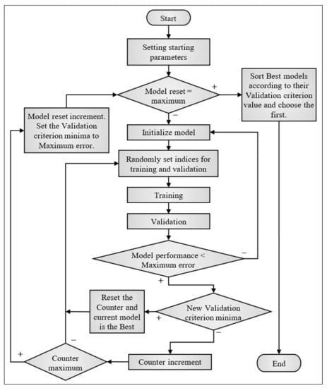 Therefore, the validation process was set as follows. Each training process increases the counter by one. If the validation criterion value achieves a lower value in less than 6 consecutive runs, the counter is restarted and the training process continues with the current network setting; otherwise, the network is reinitialized to default weights and biases. The validation criterion value was set as the sum of equalized training and validation performance, i.e., the training SSE was multiplicated by 0.15 and the validation SSE was multiplied by 0.85. The maximum number of reinitializations was set to 10 resets apart from the reinitialization due to the inappropriate initialization. The inappropriate initialization may occur after network reset and the network may get stuck in the local minima. This behavior is associated with a large performance error. In such a case, the network was reinitialized without increment of the reset counter. In the end, the model with the lowest validation criterion value was chosen for the evaluation of model performance on the testing sample.