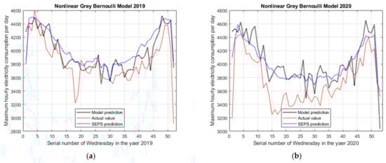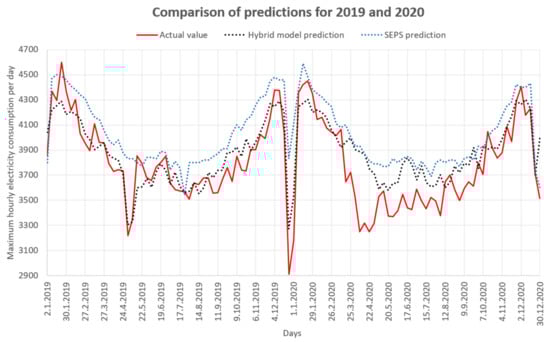 As can be seen from Table 1, all our models performed better than SEPS in 2019. From the grey models, the GM(1,1) set is more accurate than the NGBM(1,1) set. The ANN model outperformed the official SEPS predictions as well as the grey model forecasts in both 2019 and 2020. This is probably caused by additional information added in the data pre-processing phase. Namely, it is information of whether the public holiday falls on a specific Wednesday or not. The importance of public holiday information can be observed in Figure 10, where the steep decrease can be monitored in the ANN prediction. There is a public holiday in Slovakia on the 1st and 8th of May (18th and 19th Wednesday in 2019) and maximal electricity consumption was reasonably lower as surrounding points in the chart. The only model that reflects these circumstances was the ANN. On the other hand, the 53rd Wednesday in 2020 (30 December 2020) is not a public holiday and the network predicted a higher value than it should.
