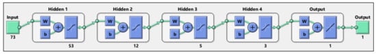The final layout of the hidden layers was divided into 4 hidden layers with 53, 12, 5, and 3 neurons in the listed order, as depicted in Figure 8.