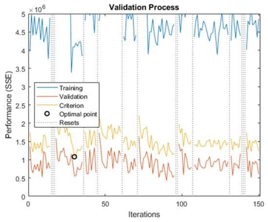 Data from the validation process can be seen in Figure 9. As it can be observed, all iterations brought relatively similar results in terms of performance measured via sum squared error. Probably, fewer resets were needed, but the figure shows another way of future research in creating a set of shallow NN components via bagging, boosting, or stacking to further improve the prediction power of ANN.