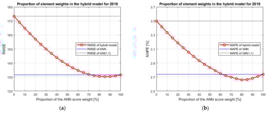 Examples of combining different models can be found in the literature, e.g., [24,26,43]. The main idea for the hybridization is to deduce if a hybrid model may lead to further improvement of prediction performance. Therefore, here the process is not standard, i.e., to find the appropriate weight distribution on the training sample and then to validate it on the testing sample, but iteration runs straight on the testing sample. The process serves as a starting point for future research. In this case, all proportion weight combinations of the predictions of ANN and GM(1,1) set were searched. The step for this iteration was set to 5%. The RMSE (12) and the MAPE (13) metrics were monitored throughout all the component combinations of the potential hybrid model.