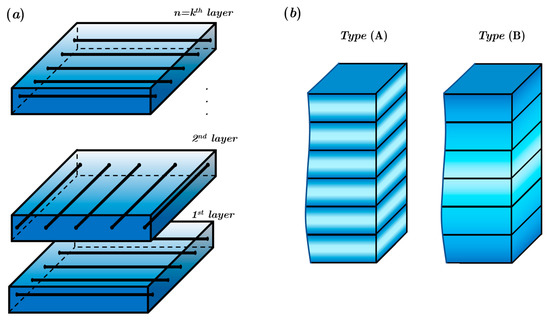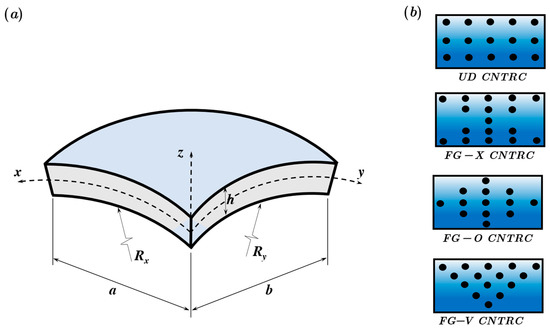 A rectangular multilayer shell in the Cartesian coordinate system, (x, y, z) is shown in Figure 1. The shell has a curved length, a, width, b, and thickness h. The principal radii of curvature of the mid-plane in x is Rx, and Ry in the y direction. The shell is reinforced by single wall carbon nanotubes (SWCNTs). All sheets of the shell have the same thickness. Four different patterns of CNT distribution are presented in this study, which are a uniform distribution UD and three functionally graded distributions, FG-X FG-V and FG-O. Two types of cross-ply multilayer CNTRC shells are proposed.