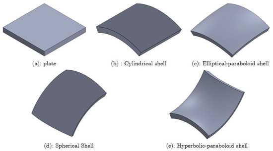 In the following study, a parametric analysis of the vibration of CNTRC shells was carried out. As mentioned in the previous section, two types of laminated shells are proposed: CNTRC(A) and CNTRC(B). For the straight plate, the radii of curvature are , and for the spherical shell, and for the cylindrical shell, and for the hyperbolic-paraboloid shell, and for the elliptical-paraboloid shell (Figure 3).