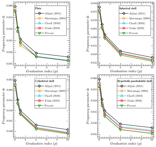 The accuracy of the proposed procedure will be checked in this section. The developed procedure is applied to obtain results for the free vibration of functionally graded plates and shells. For the straight plate, the radii of curvature are , and for the spherical shell, and for the cylindrical shell, and for the hyperbolic-paraboloid shell, and for the elliptical-paraboloid shell (see Figure 3). The obtained results are compared with those generated in the literature using various solution techniques, as shown in Figure 4. The material characteristics used for verification are as follows: alumina (AlO2) as ceramic with material properties; (, ) and aluminium (Al) as metal with the following characteristics: (, ). Poisson’s ratio is taken as . Comparison between results shows good agreement verifiying the accuracy of the developed procedure.